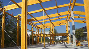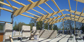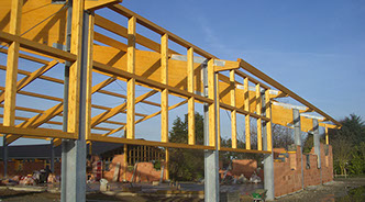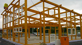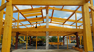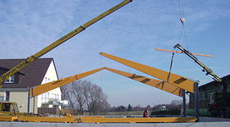 Holzhauskonstruktionen als reines Ständerwerk werden ausschließlich aus verleimtem BS-Holz über eine CNC-Anlage gefertigt. Der Fertigung liegt eine 3-dimensionale Computerplanung zugrunde.