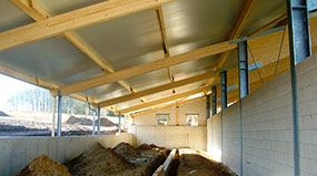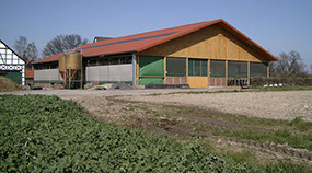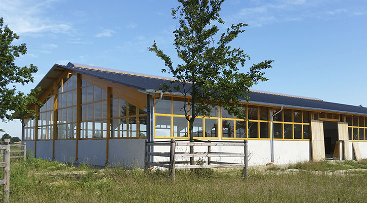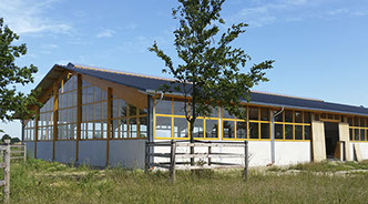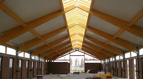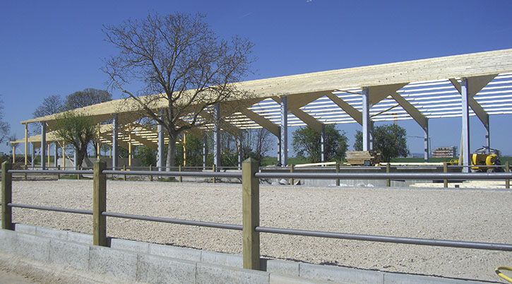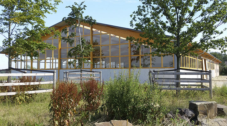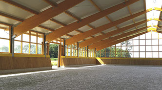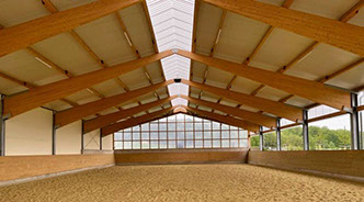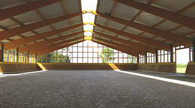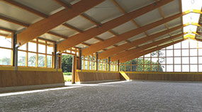 Die Dreigelenkrahmenkonstruktion mit Stahlstützen schafft weite Spannweiten und eignet sich somit optimal für verschiedenste Möglichkeiten sowohl im Reitsport, als auch für Gewerbe und Handel.