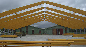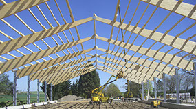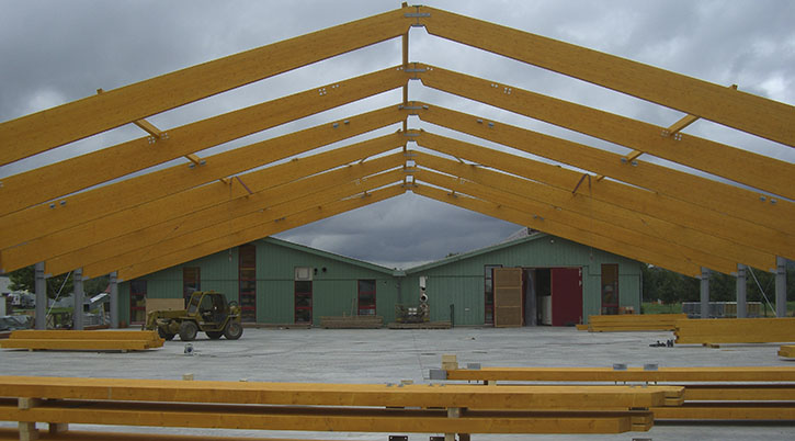 Trotz großer Dimensionen verleihen die sich zum First hin verjüngenden verleimten Binderrriegel diesem Bauwerk eine optische Leichtigkeit.