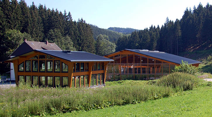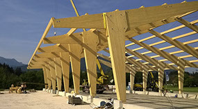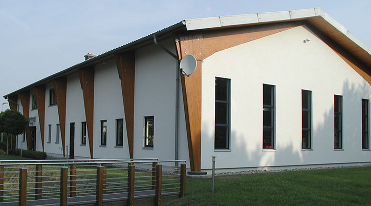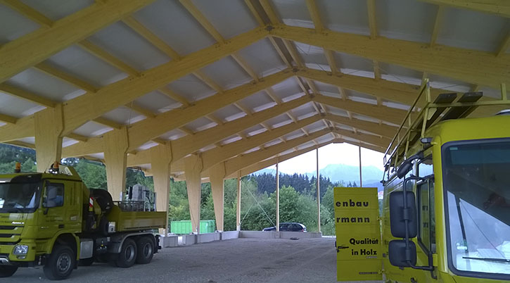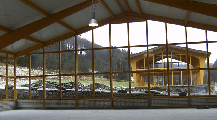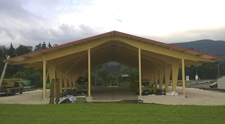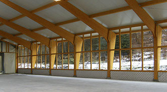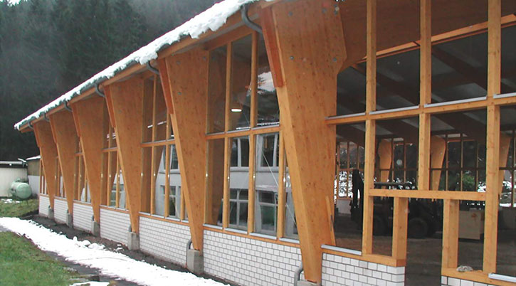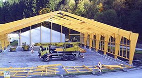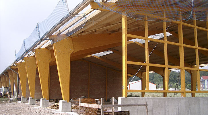 Gerade für den industriellen Zweck bietet die Holzleimbauweise Dank möglicher großer Spannweiten und weitgehend stützenfreier Konstruktionen gute wirtschaftliche Lösungen. So schaffen wir flexible Nutzungsmöglichkeiten der Hallenräume, welche durch in Eigenleistung erbrachte Arbeiten (z.B. Fundamente, Innenausbau, Tore) individuell ergänzt werden können. Der Naturbaustoff Holz verleiht trotz der großen Dimensionen jedem Bauwerk einen „warmen Charakter“.