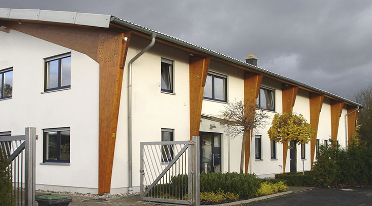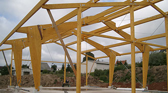 Durch die konstruktive Verbindung (Stabdübel) zwischen Binderstiel und Binderriegel lassen sich alle gewünschten Dachneigungen leicht herstellen. Die verleimten Holzteile sind feuerhemmend F30.