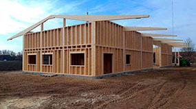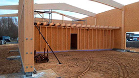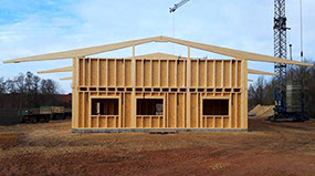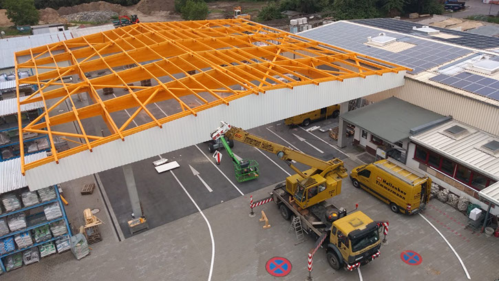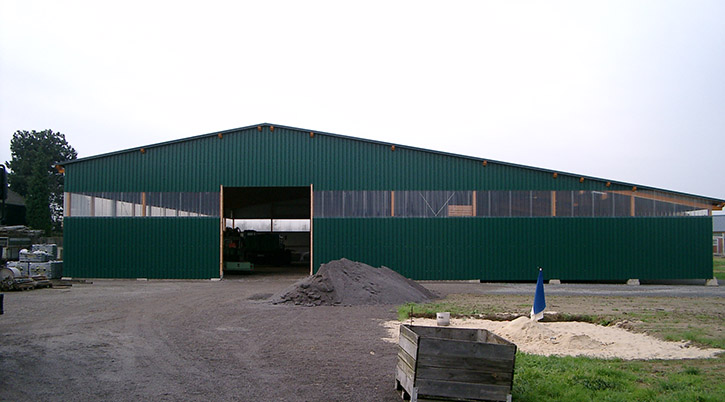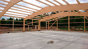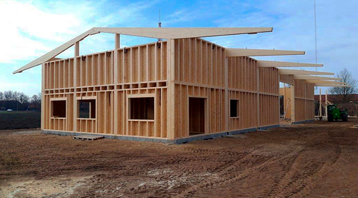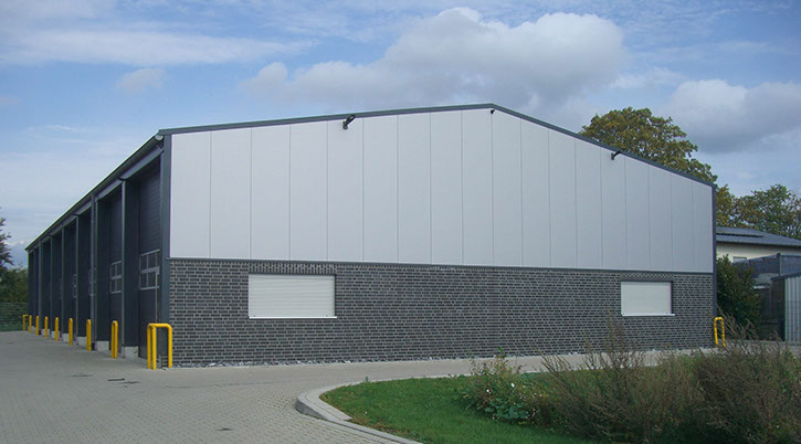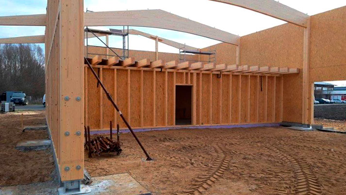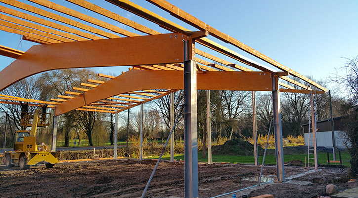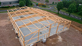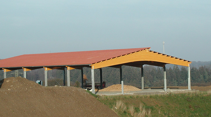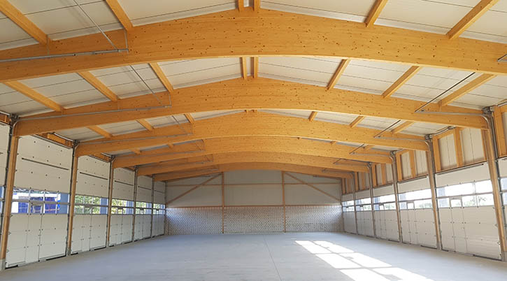 Gerade für den industriellen Zweck bietet die Holzleimbauweise Dank möglicher großer Spannweiten und weitgehend stützenfreier Konstruktionen gute wirtschaftliche Lösungen. So schaffen wir flexible Nutzungsmöglichkeiten der Hallenräume, welche durch in Eigenleistung erbrachte Arbeiten